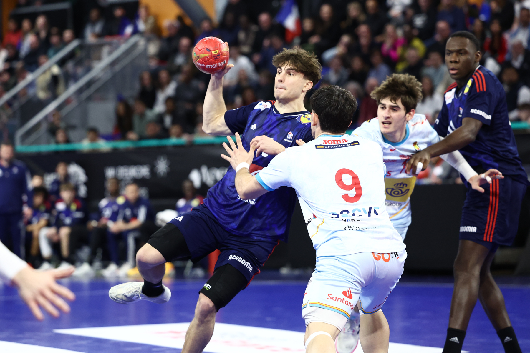 La pluie d’exclusions temporaires concédées par l’Espagne favorise les Bleuets à prendre le large dans ce premier acte (13-8, 20e). Mais au fil des minutes, la France connaît des échecs et, malgré des arrêts de Stanis Soullier, se fait rattraper au tableau d’affichage (15-12, 27e). Les tirs faciles, manqués par les Français coûtent cher. L’Espagne, après un jet de sept mètres convertit par Delgado, regagne les vestiaires avec deux buts de retard (16-14).