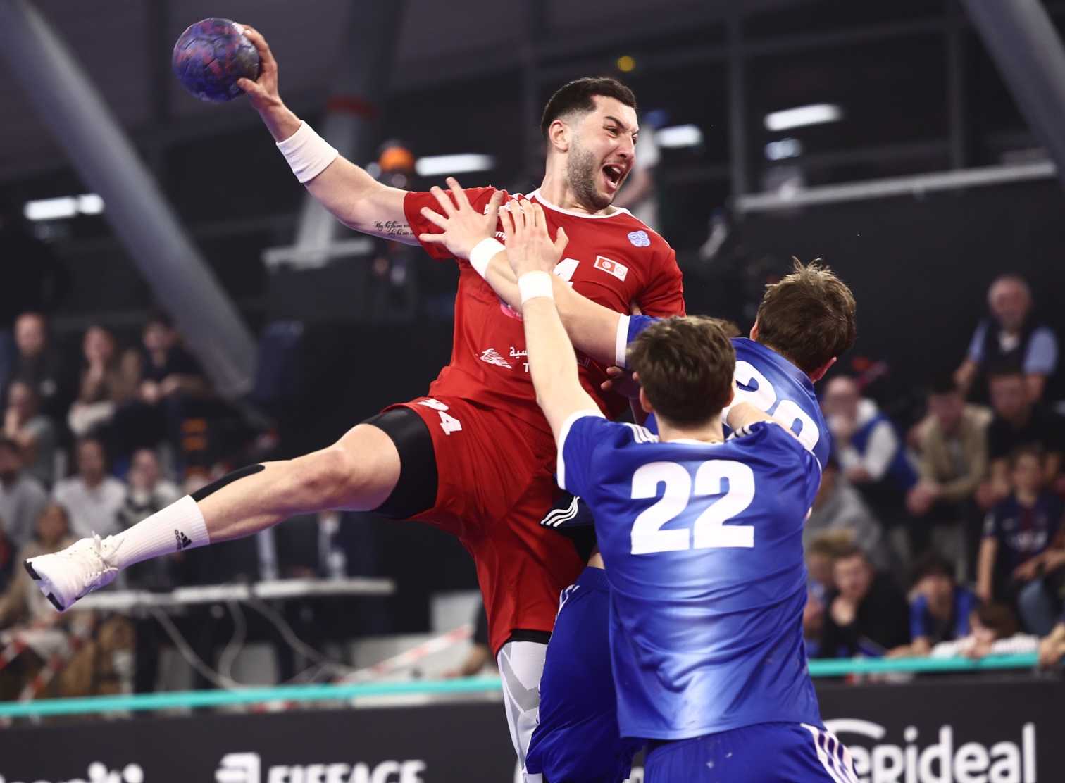 La Tunisie tient le bon bout et réduit au fil des minutes l’écart au tableau d’affichage, profitant d’un manque de mordant défensif adverse pour recoller grâce au surpuissant Mohamed Ben Fredj (9-9, 22e). Les deux formations se livrent alors de grandes empoignades et se tiennent dans un véritable mouchoir de poche, se rendant coup pour coup. Et même si la Tunisie est très limite défensivement avec des gestes souvent sanctionnés par des exclusions temporaires, la France peine à profiter de ses supériorités. Poussive, la sélection tricolore regagne tout de même les vestiaires avec trois longueurs d’avance à la pause (14-11).