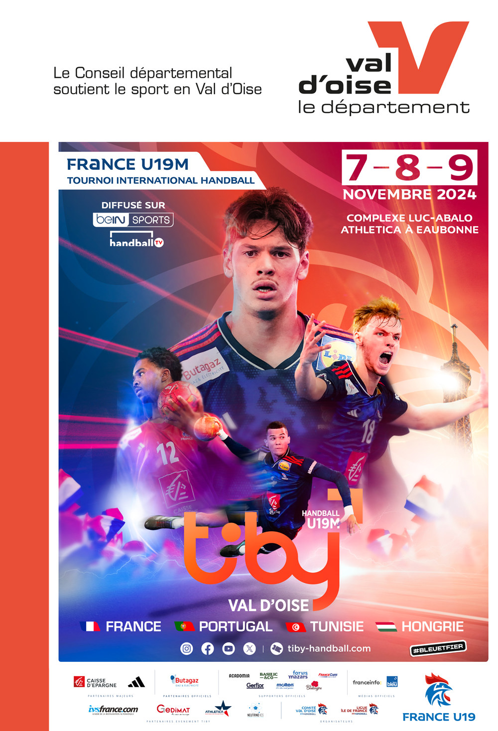 L'équipe de France Jeunes U19M vous invite à marquer les dates du 7, 8 et 9 novembre dans vos agendas pour la 21ème édition du TIBY Handball Val d'Oise. Cette année, les organisateurs ont opté pour un plateau sportif de haut niveau, avec la présence notamment de la Tunisie, de la Hongrie et de le Portugal au programme. Affronter des adversaires de cette envergure représente une opportunité importante pour progresser. La génération des jeunes talents nés en 2006-2007 est déterminée à mettre en avant tout son potentiel dans le but de bien se préparer pour le prochain Championnat du Monde, qui constitue l'objectif majeur de la fin de cette saison.