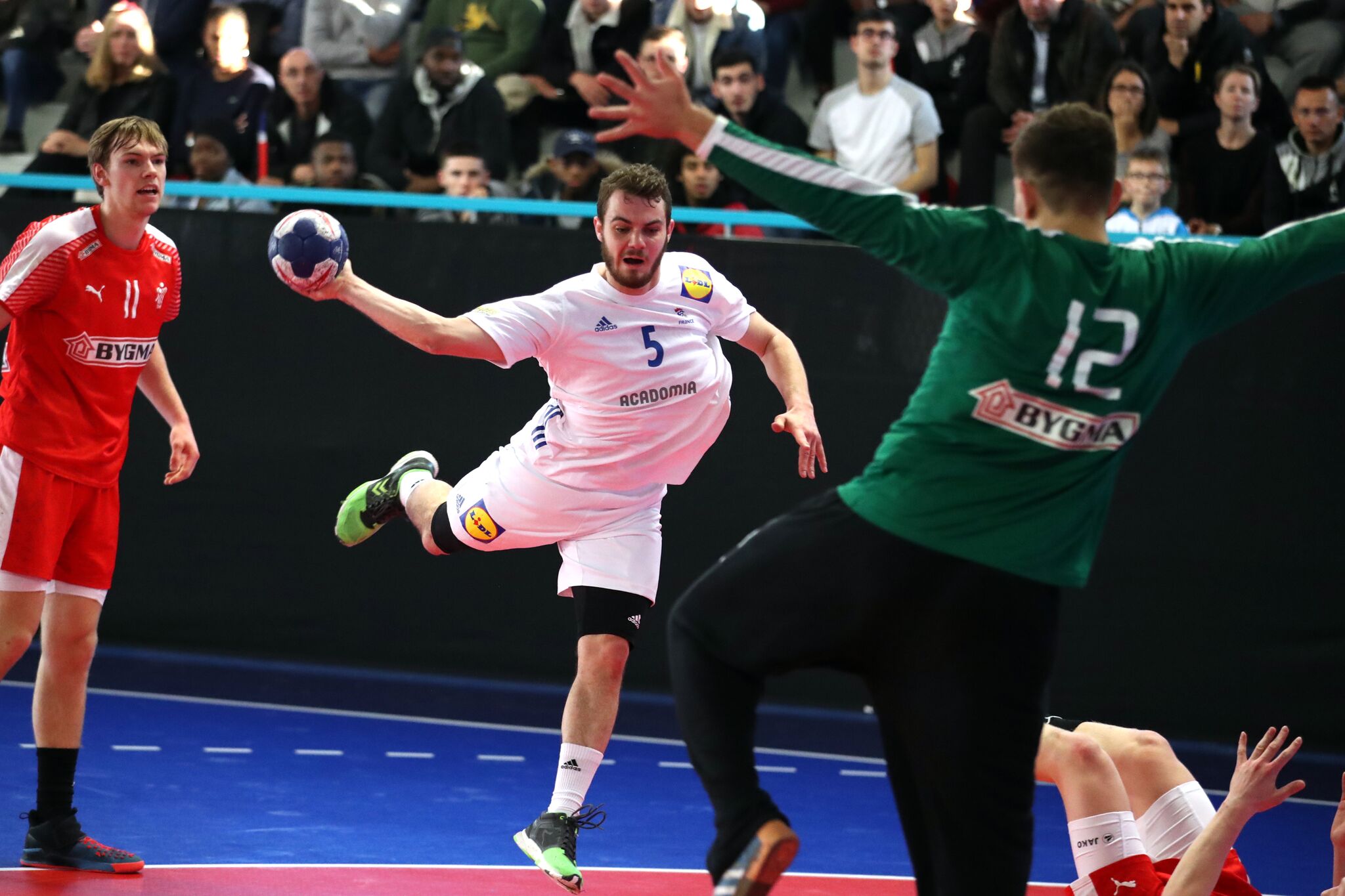 Début de rencontre difficile pour les Espoirs et Kyllian Villeminot (4/6) qui manque un face avant d'être exclu pour 2 minutes (3'). Les Danois mènent de 2 buts et imposent une double infériorité numérique aux tricolores avec l'exclusion du capitaine Jonathan Mapu (4'). Les Danois profitent de ce temps pour maintenir l'écart (3-1, 6'). Kyllian Villeminot et Jonathan Mapu se font pardonner leur exclusions en réduisant le score (2-3, Villeminot à la passe, Mapu à la conclusion).