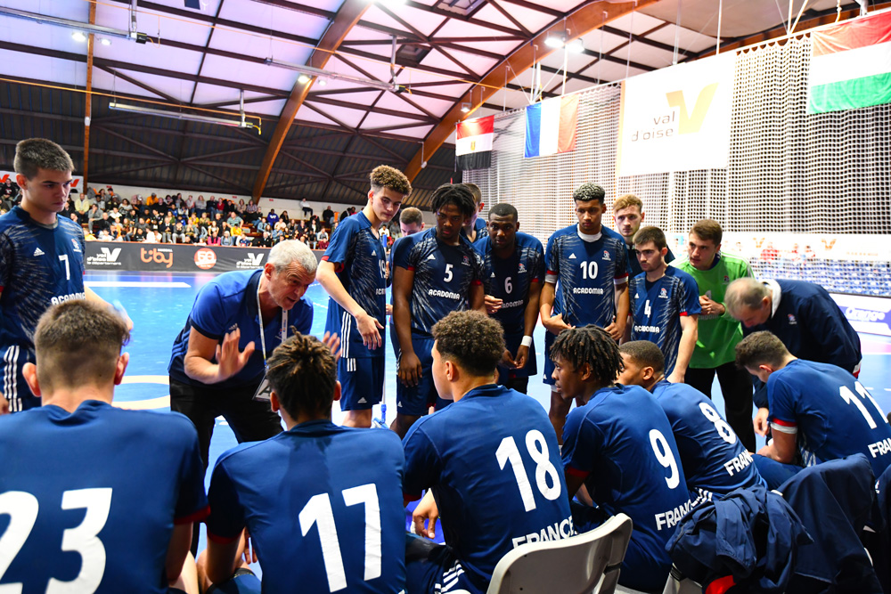L'exclusion pour 2 minutes d'Anzuini pénalise toutefois son équipe puisque l'équipe egyptienne recolle à 10-10 (22'). L'inconstance des jeunes français permet aux Pharaons de repasser devant à seulement 4 minutes de la pause (11-13). Le début de match de Loic Spady dans la cage tricolore permet aux Minots de rester dans le match, notamment grace à un arret de classe sur jet de 7 mètre (29'). À l'image de leur capitaine Mandiangu, exclu juste avant la mi-temps, les bleus retombent dans leurs travers et se relachent (12-15). C'est un Éric Quintin désabusé qui raccompagne ses joueurs aux vestiaires.