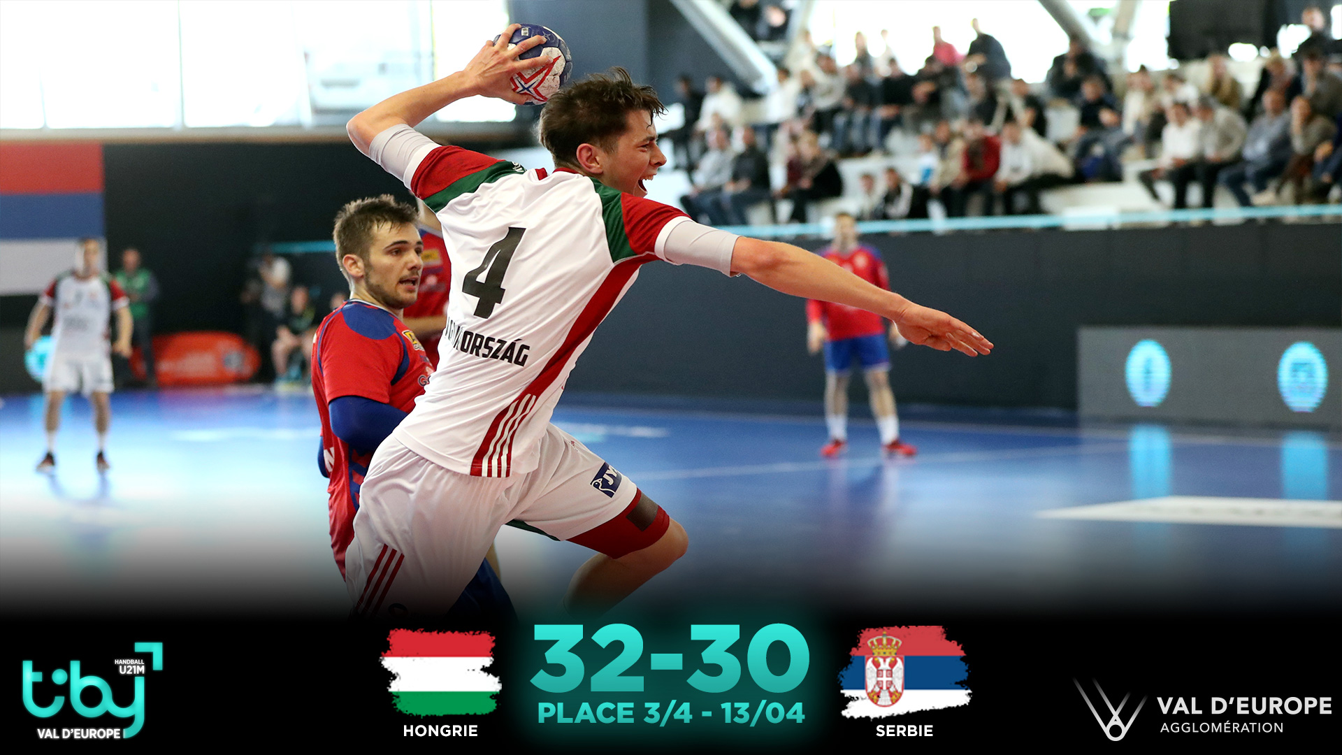 Après une seconde exclusion temporaire, la Serbie reprend ses esprits et entame le dernier quart d'heure avec un avantage de 2 buts (25-23, 45'). Les spectateurs du Tiby Val d'Europe assistent à une petite finale de toute beauté avec une fin de match totalement indécise puisque les Hongrois mènent 28-27 à seulement 5 minutes du terme. Des Hongrois retrouvés en défense offrent un défi physique de taille aux jeunes serbes. Grâce à l'intenable Gergo Spekhardt, la Hongrie s'offre un break de 2 buts (31-29, 57'). La fin de match s'annonce difficile pour les Serbes menée 31-29 en en infériorité numérique pour les 2 dernières minutes. La double parade de Kristof Gyorgi scèle définitivement la victoire pour la Hongrie.