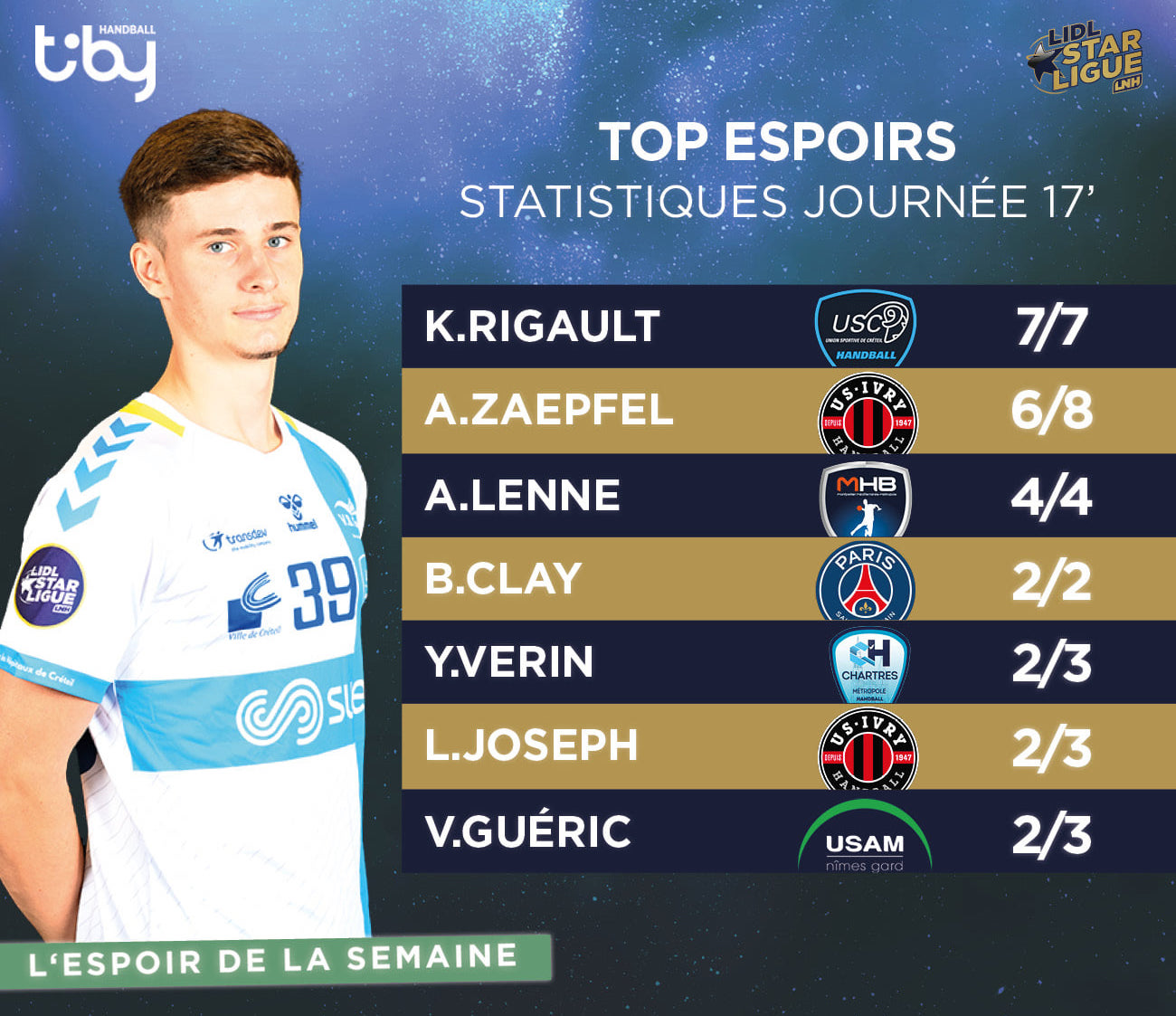 Kylian Rigault continue de régaler, nous étonne par sa créativité, ses qualités de buteur et sa présence dans les duels. Il signe la prestation de la semaine avec un joli 7/7. Mention spéciale pour Arthur Lenne et Aymeric Zaepfel qui se sont affrontés et distingués au cours d'une belle partie de Lidl Starligue.