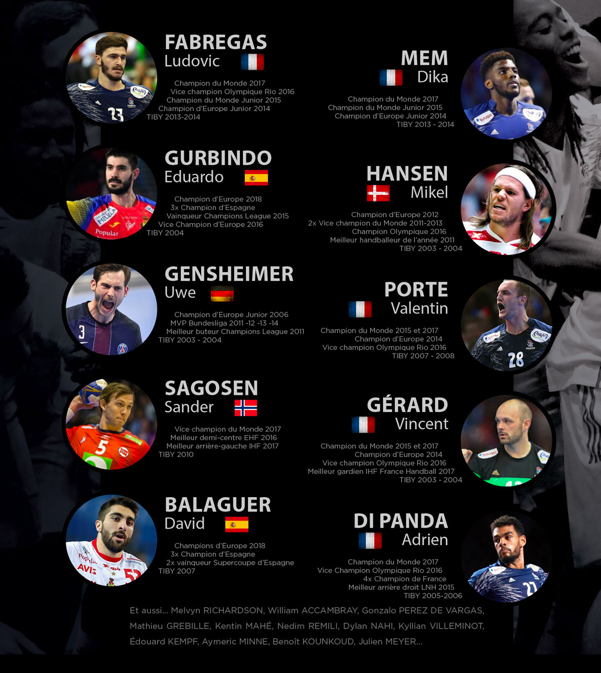 Une pléiade de joueurs de talent ont foulé les parquets du TIBY Handball ; un souvenir impérissable pour des specateurs qui peuvent se targuer d’avoir assisté à l’éclosion de certaines des plus grandes stars du handball mondial.